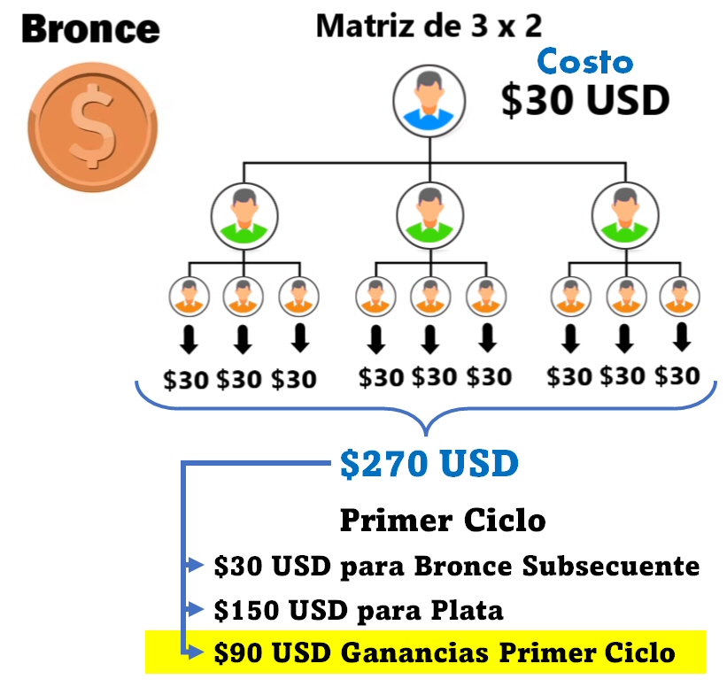 Al igual que la Matriz de Bronce del primer ciclo, usted podrá obtener como ingresos un total de $270 dólares. Es decir, $30 dólares por cada una de las 9 personas que conforman el segundo nivel de la matriz.