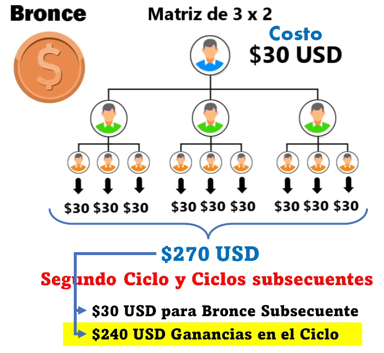 Estos $240 dólares sera la cantidad final que usted obtendrá como ganancia por haber llenado la Matriz de Bronce en el segundo ciclo y así será en los ciclos subsecuentes. Este dinero estará disponible para usted en todo momento. Para mayores detalles observe la gráfica de esta matriz para segundo ciclo y ciclos subsecuentes.