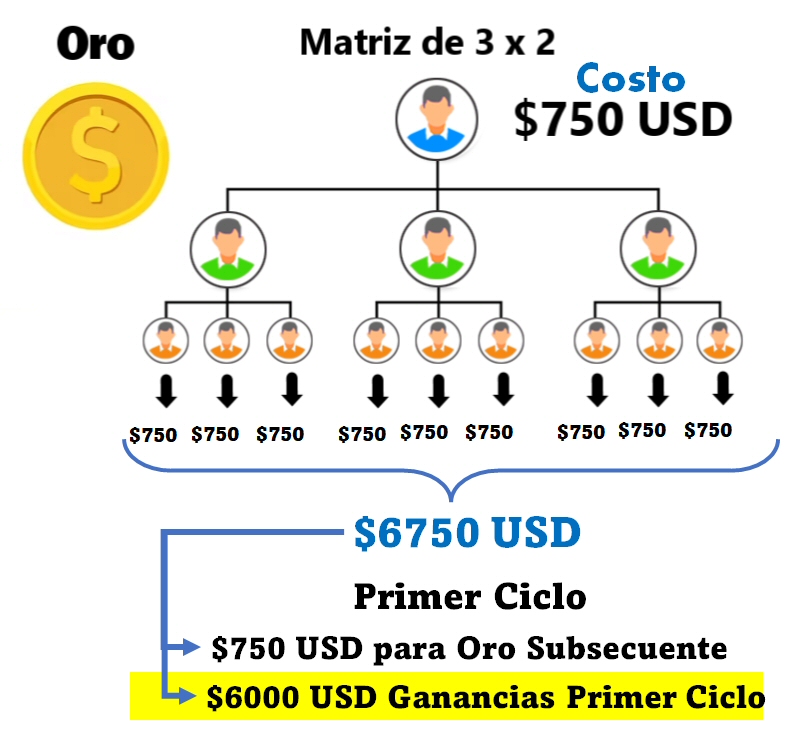 Al igual que la Matriz de Oro del primer ciclo, usted podrá obtener como ingresos un total de $6750 dólares. Es decir, $750 dólares por cada una de las 9 personas que conforman el segundo nivel de la matriz.
