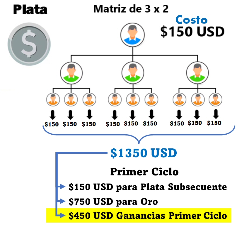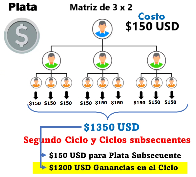 El costo de ingreso a la Matriz de Plata en el segundo ciclo y ciclos subsecuentes es de $150 dólares de los cuales usted tampoco pagará nada. Los $150 dólares se obtienen como resultado de haber llenado la Matriz de Plata del primer ciclo.